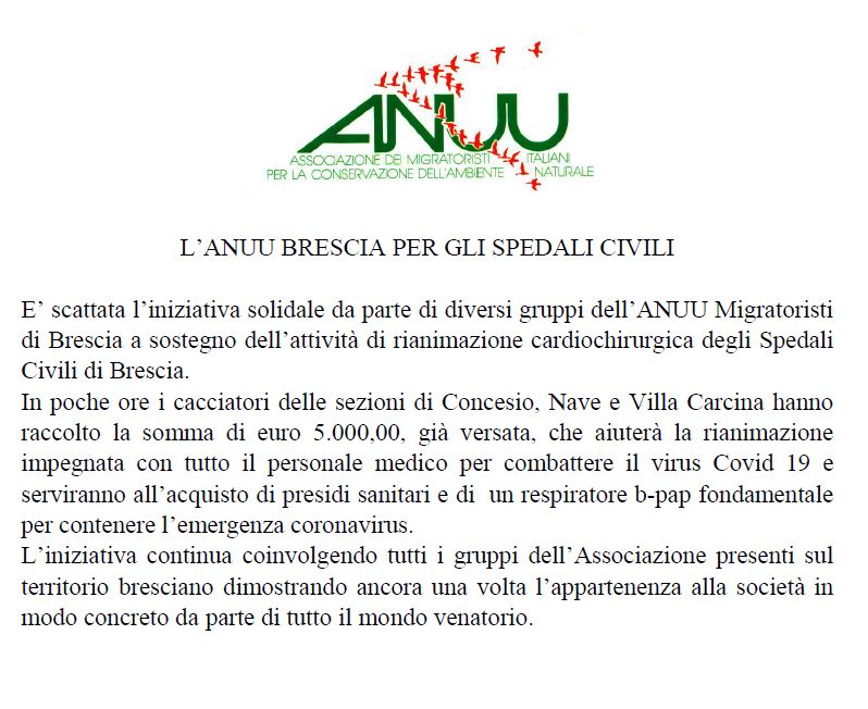 Il gran cuore dei cacciatori ai tempi del Coronavirus: il COMPRENSORIO DI CACCIA C6 DI VALLE TROMPIA ha donato 4000,00 euro all'iniziativa di Solidarietà AIUTIAMO BRESCIA e 1000,00 Euro alla Associazione VALTROMPIA SOCCORSO. Grazie per la segnalazione a Mario Bertella